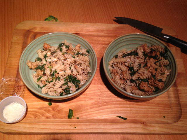 Pasta in a sausage and kale cream sauce